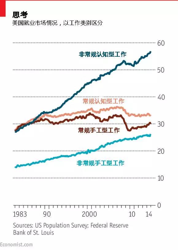 經(jīng)濟(jì)學(xué)家正在擔(dān)心「職業(yè)兩極化」的風(fēng)險(xiǎn),也就是說中層技術(shù)的工作(例如制造業(yè))正在消失,而低等和高等工作在擴(kuò)張。實(shí)際上,工作可以被劃分為兩種常規(guī)職業(yè):第一種即高薪水高技術(shù)的職業(yè)(建筑師,高級管理),還有低薪水低技術(shù)的職業(yè)(清潔工,快餐員)。許多西方國家中層職業(yè)薪水的停滯都表現(xiàn)出自動化已經(jīng)開始產(chǎn)生影響——盡管這與外包的影響很難區(qū)分出來,后者也取代了許多發(fā)展中國家的底薪國家中日?;墓ぷ鳎ɡ缰圃鞓I(yè)和呼叫中心)。圣路易斯聯(lián)邦儲備銀行發(fā)表的數(shù)據(jù)顯示,在美國,非常規(guī)認(rèn)知型工作以及非常規(guī)手工型工作自1980年后逐步增長,而常規(guī)化工作則一直維持幾乎不變。隨著更多工作自動化,這種趨勢很可能會延續(xù)下去。