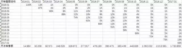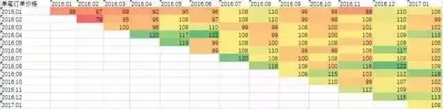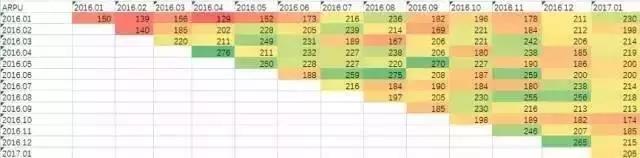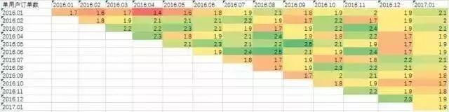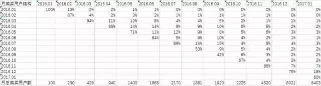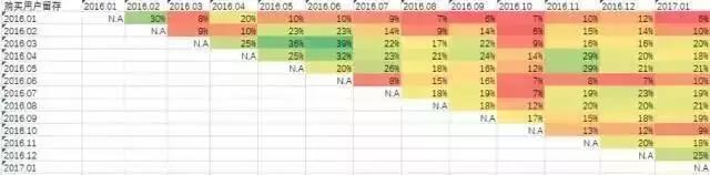 我們可以看到16年1月的購買用戶,第二個(gè)月留存(次月復(fù)購)是30%,3月是8%。2月新增用戶,次月留存為9%,即只有9%的用戶在第二個(gè)月進(jìn)行了購買。橫向看,我們發(fā)現(xiàn)3-5月獲取的質(zhì)量比較優(yōu)質(zhì),其留存(復(fù)購)比較好,維持在比較高的水平,可能是公司發(fā)現(xiàn)了獲取用戶的優(yōu)質(zhì)來源,亦或者是對(duì)其進(jìn)行了有針對(duì)性的運(yùn)營。之后用戶的留存維持在比3-5月低,但是還是比較穩(wěn)定的水平,可能是單一渠道優(yōu)質(zhì)的量已經(jīng)比較枯竭,因?yàn)楣緲I(yè)務(wù)量有了不錯(cuò)的成長。