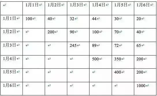 以此類推,1月3日獲取的新用戶有一個(gè)留存狀況、1月4日5日···以后每天都有一個(gè)留存表格。把這些表格放在一起,就是一個(gè)巨大的斜對(duì)角矩陣: