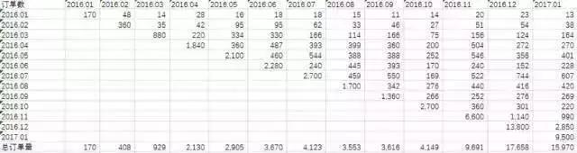 公司在16年1月有100個(gè)購買用戶,下了170單,總共消費(fèi)14,960元。這100個(gè)用戶在2月有30個(gè)用戶進(jìn)行了購買,下了48單,消費(fèi)4,176元。2月份新增200個(gè)購買用戶,下了360單,消費(fèi)28,080元。在2017年1月,一共有8,403個(gè)購買用戶,其中5,000名是當(dāng)月新增,其他是復(fù)購的老用戶;下了15,970單,金額約173萬,其中約70萬是老用戶復(fù)購,100萬是當(dāng)月新增用戶消費(fèi)。