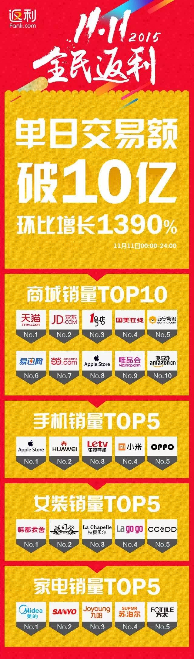11月12日消息,電商導(dǎo)購(gòu)平臺(tái)返利網(wǎng)公布了今年“雙11網(wǎng)購(gòu)狂歡節(jié)”的業(yè)績(jī):11月11日0點(diǎn)至24點(diǎn),返利網(wǎng)平臺(tái)交易額突破10億元,環(huán)比增長(zhǎng)1390%,成為各大電商重要的引流平臺(tái)。