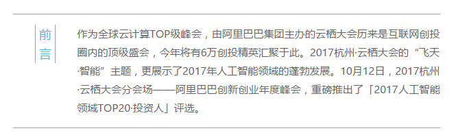 通過本次「2017人工智能領域TOP20·投資人」活動,在聚集了全國上萬創(chuàng)投精英的云棲大會現(xiàn)場頒獎,表彰與致敬了那些真正深耕人工智能領域的投資人,是鼓勵更多具有冒險創(chuàng)新精神的投資新力量誕生,也是在邀請更多人參與和開啟這個屬于人工智能領域的大時代。