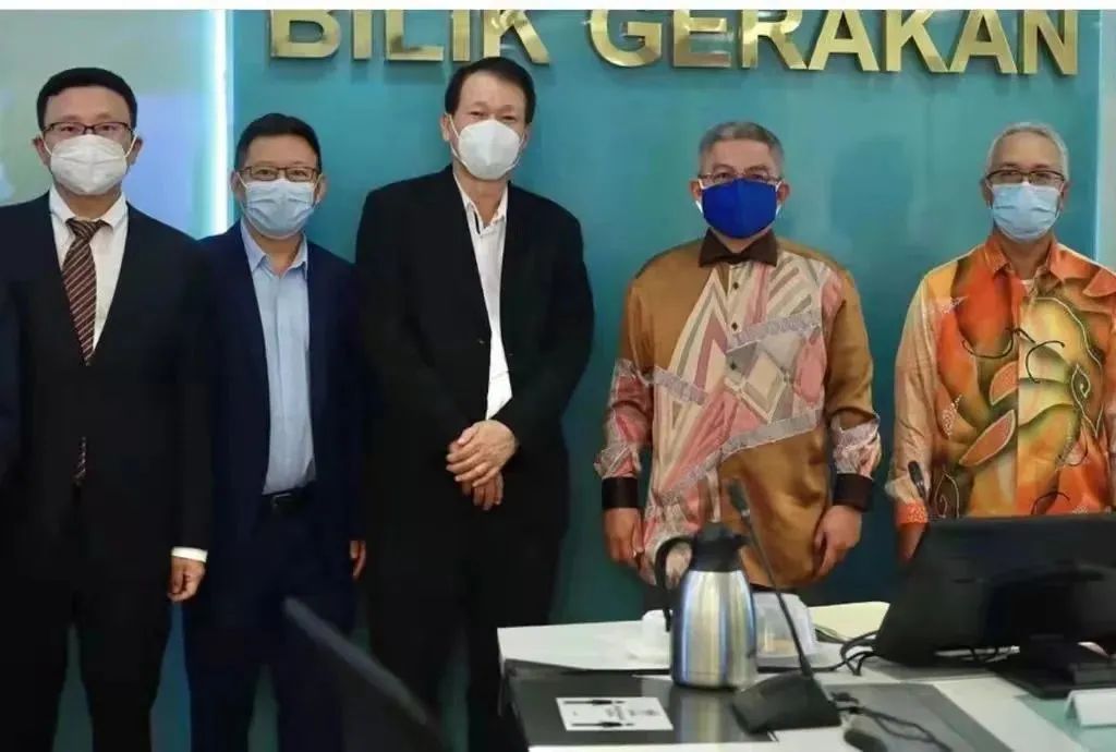 康希諾生物國(guó)際業(yè)務(wù)副總裁王鴻義(左一)、對(duì)外項(xiàng)目合作及科學(xué)事務(wù)部副總裁莘春林(左二)與馬來(lái)西亞科技部部長(zhǎng)阿扎姆(右二)