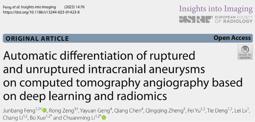 在啟明創(chuàng)投投資企業(yè)數(shù)坤科技的助力下,重慶大學(xué)附屬中心醫(yī)院醫(yī)學(xué)影像科、重慶市急救醫(yī)療中心醫(yī)學(xué)影像科、重慶醫(yī)科大學(xué)附屬第二醫(yī)院放射科的專家利用深度學(xué)習(xí)和影像組學(xué)技術(shù)自動(dòng)檢測(cè)和區(qū)分破裂和未破裂的顱內(nèi)動(dòng)脈瘤,其科研論文近期被歐洲放射學(xué)會(huì)(ESR)期刊Insights into Imaging收錄。