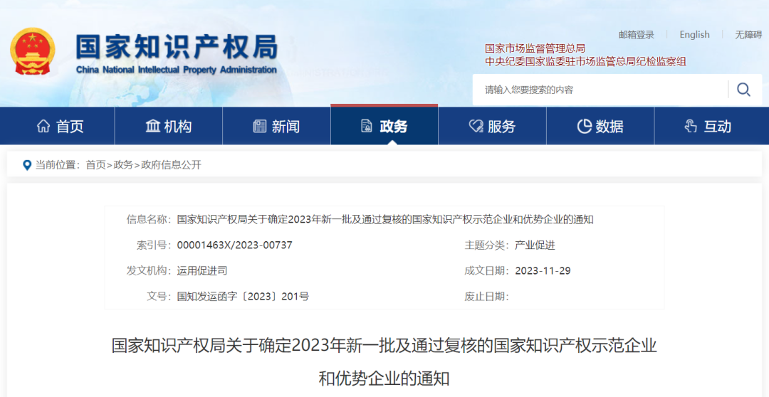 為深入貫徹落實《知識產(chǎn)權(quán)強(qiáng)國建設(shè)綱要(2021—2035年)》和《“十四五”國家知識產(chǎn)權(quán)保護(hù)和運(yùn)用規(guī)劃》決策部署,根據(jù)《國家知識產(chǎn)權(quán)局辦公室關(guān)于面向企業(yè)開展2023年度知識產(chǎn)權(quán)強(qiáng)國建設(shè)示范工作的通知》(國知辦函運(yùn)字〔2023〕572號)要求,經(jīng)企業(yè)申報、組織測評、地方知識產(chǎn)權(quán)管理部門推薦,國家知識產(chǎn)權(quán)局近日審核確定新一批國家知識產(chǎn)權(quán)示范企業(yè)、新一批國家知識產(chǎn)權(quán)優(yōu)勢企業(yè)名單,培育期限為2023年11月至2026年10月。