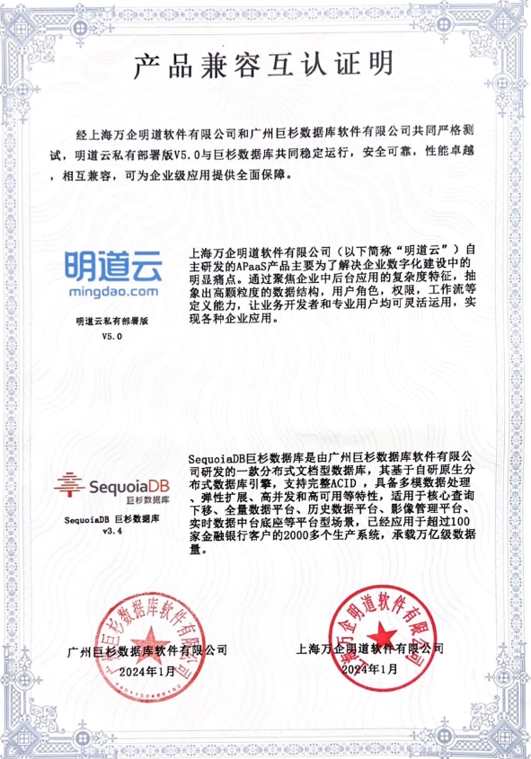 近日,啟明創(chuàng)投投資企業(yè)巨杉數(shù)據(jù)庫與明道云宣布,經(jīng)過雙方共同測試,巨杉數(shù)據(jù)庫SequoiaDB V3.4與明道云私有部署版V5.0已完成產(chǎn)品兼容認(rèn)證,能夠共同穩(wěn)定運(yùn)行。
