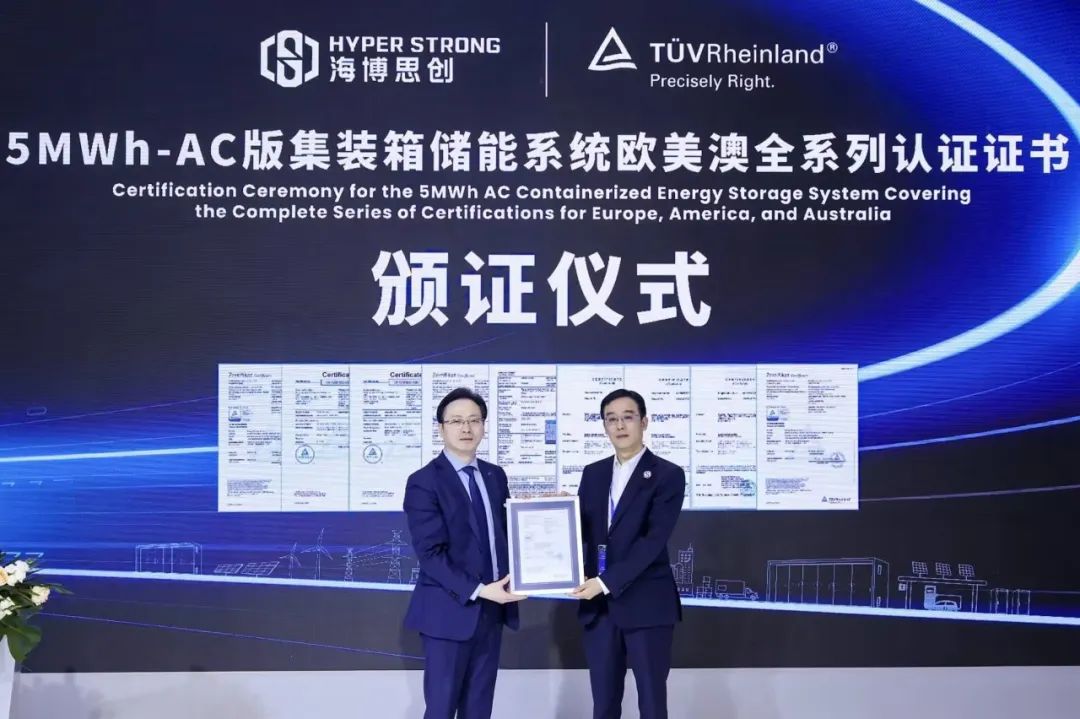 在第十三屆儲(chǔ)能國際峰會(huì)暨展覽會(huì)(ESIE 2025)現(xiàn)場,啟明創(chuàng)投投資企業(yè)海博思創(chuàng)(688411.SH)的5MWh-AC儲(chǔ)能系統(tǒng)產(chǎn)品獲得由權(quán)威機(jī)構(gòu)TüV萊茵頒發(fā)的歐美澳全系列認(rèn)證證書,這標(biāo)志著海博思創(chuàng)的5MWh-AC產(chǎn)品成功通過了歐洲、北美、澳洲的產(chǎn)品檢測認(rèn)證,該產(chǎn)品在電氣安全、功能性能、環(huán)境適應(yīng)性與電網(wǎng)兼容性等核心維度全面滿足國際主流市場的高標(biāo)準(zhǔn)要求。