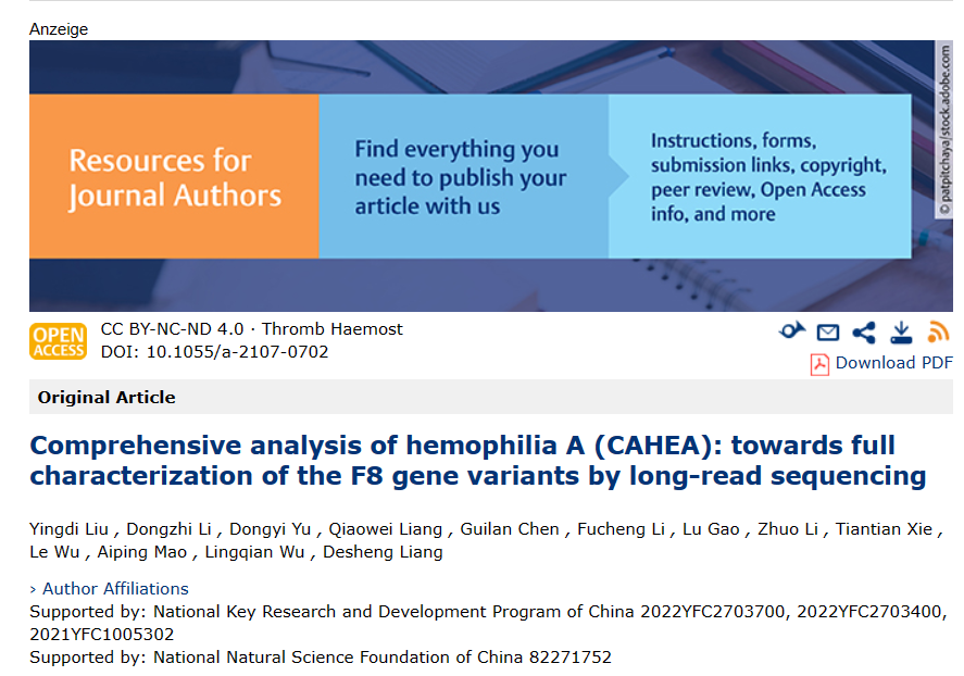近日,由中南大學(xué)醫(yī)學(xué)遺傳學(xué)研究中心牽頭、廣州市婦女兒童醫(yī)療中心、山東省婦幼保健院聯(lián)合發(fā)表的基于三代測序創(chuàng)新技術(shù)平臺血友病A臨床回顧性研究成果在國際權(quán)威學(xué)術(shù)期刊Thrombosis and Haemostasis(《血栓與止血》,一區(qū) IF=6.830)發(fā)表。該項研究成果由啟明創(chuàng)投投資企業(yè)貝瑞基因提供技術(shù)支持,是我國基于三代測序平臺開發(fā)復(fù)雜基因變異疾病診斷新技術(shù)的又一次重大突破。