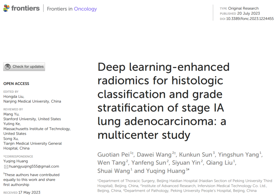 近日,啟明創(chuàng)投投資企業(yè)推想醫(yī)療與北京市海淀醫(yī)院胸外科開展聯(lián)合課題,在北京大學(xué)人民醫(yī)院(胸外科、病理科和放射科)的大力協(xié)助下,相關(guān)成果得到同行專家的高度認(rèn)可,論文被收錄于Frontiers in Oncology期刊。