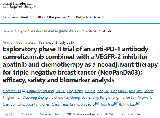 四川大學華西醫(yī)院羅婷教授團隊此前開展了一項單臂II期臨床試驗(NeoPanDa03),創(chuàng)新性地將抗PD-1抗體卡瑞利珠單抗、VEGFR-2抑制劑阿帕替尼與化療聯合,用于早期或局部晚期三陰性乳腺癌(TNBC)的新輔助治療(NAT)。該三聯方案的總病理完全緩解(tpCR)率高達67.6%,顯示出顯著的臨床潛力。相關研究成果發(fā)表于Nature子刊Signal Transduction and Targeted Therapy(STTT)(IF: 52.7),啟明創(chuàng)投投資企業(yè)艾德生物(300685.SZ)深度參與此項研究,通過多組學分析揭示了療效相關生物標志物。
