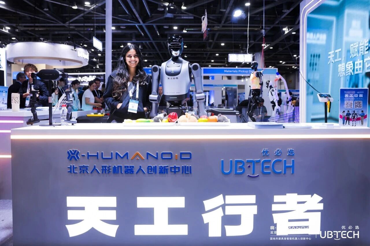 在展區(qū),優(yōu)必選攜北京人形機(jī)器人創(chuàng)新中心聯(lián)合展出具身天工、慧思開物、天工行者等重磅產(chǎn)品,全方位呈現(xiàn)全尺寸人形機(jī)器人前沿技術(shù)、創(chuàng)新成果及開發(fā)者生態(tài)。