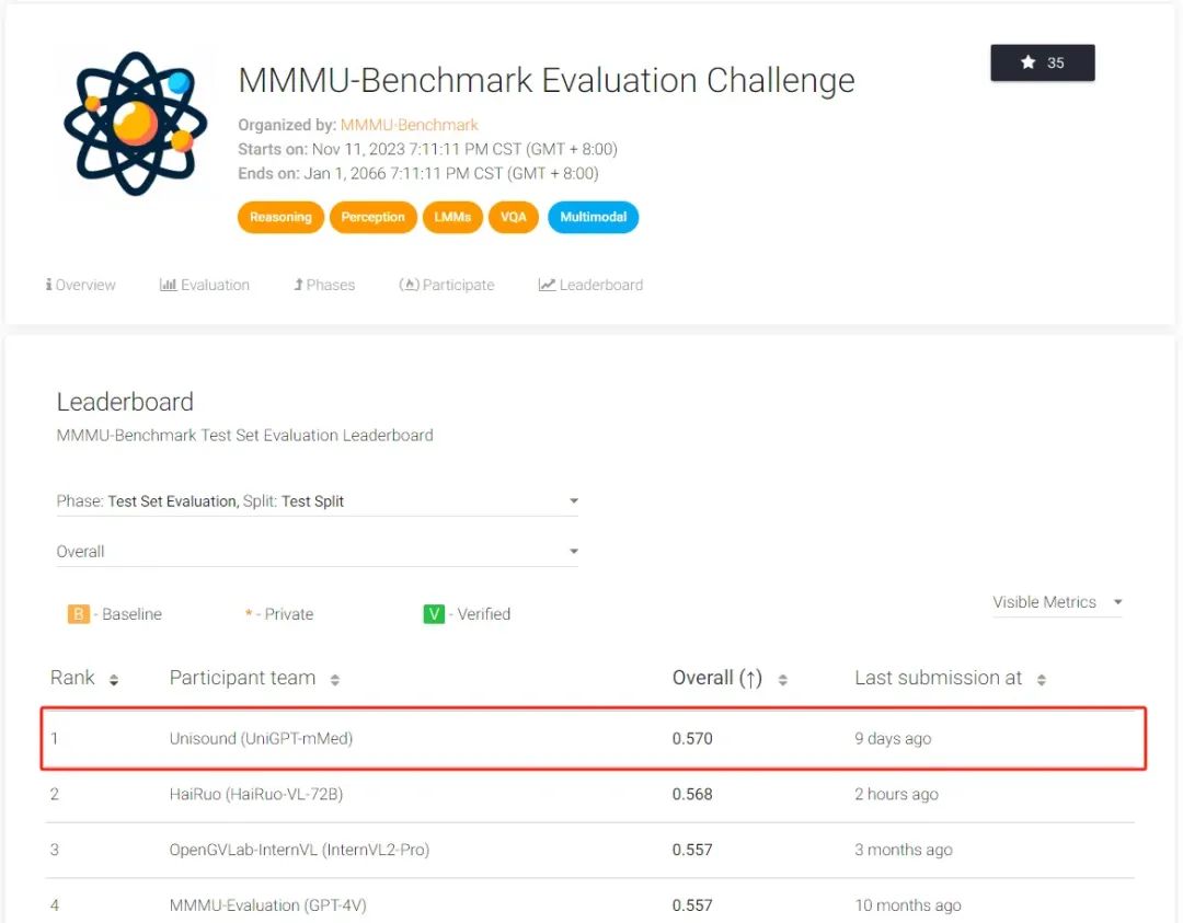 近日,多模態(tài)人工智能模型基準評測集MMMU更新結果,啟明創(chuàng)投投資企業(yè)云知聲的山海多模態(tài)大模型UniGPT-mMed在通用能力、醫(yī)療專業(yè)能力評測中排名第一,充分彰顯其硬核實力。