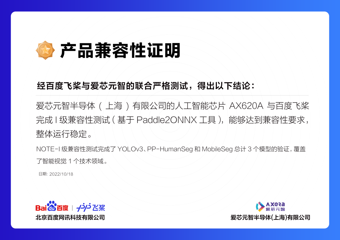 本次測(cè)試基于愛芯元智AX620A的社區(qū)開發(fā)套件“愛芯派?”AXera-Pi?,共完成了YOLOv3、PP-HumanSeg和MobileSeg總計(jì)3個(gè)模型的驗(yàn)證,覆蓋智能視覺技術(shù)領(lǐng)域。通過(guò)雙方嚴(yán)格的聯(lián)合測(cè)試表明,愛芯元智AX620A在YOLOv3、PP-HumanSeg和MobileSeg模型上的精度、速度等各方面性能表現(xiàn)滿足要求,與百度飛槳的兼容性表現(xiàn)良好,達(dá)到了I級(jí)適配互認(rèn)要求。