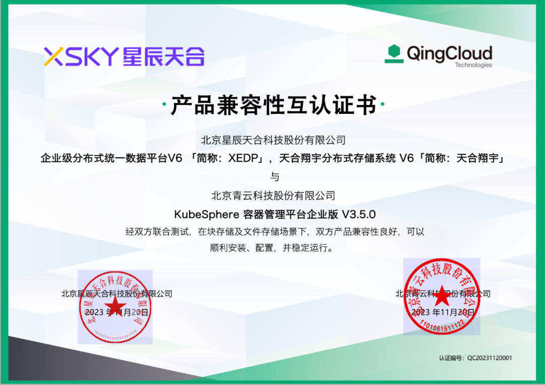 近日,青云科技的KubeSphere企業(yè)版容器平臺成功完成了與啟明創(chuàng)投投資企業(yè)XSKY星辰天合的企業(yè)級分布式統(tǒng)一數據平臺V6以及天合翔宇分布式存儲系統(tǒng)V6兼容性互認證,進一步豐富了企業(yè)在容器技術及容器數據存儲上的選擇。