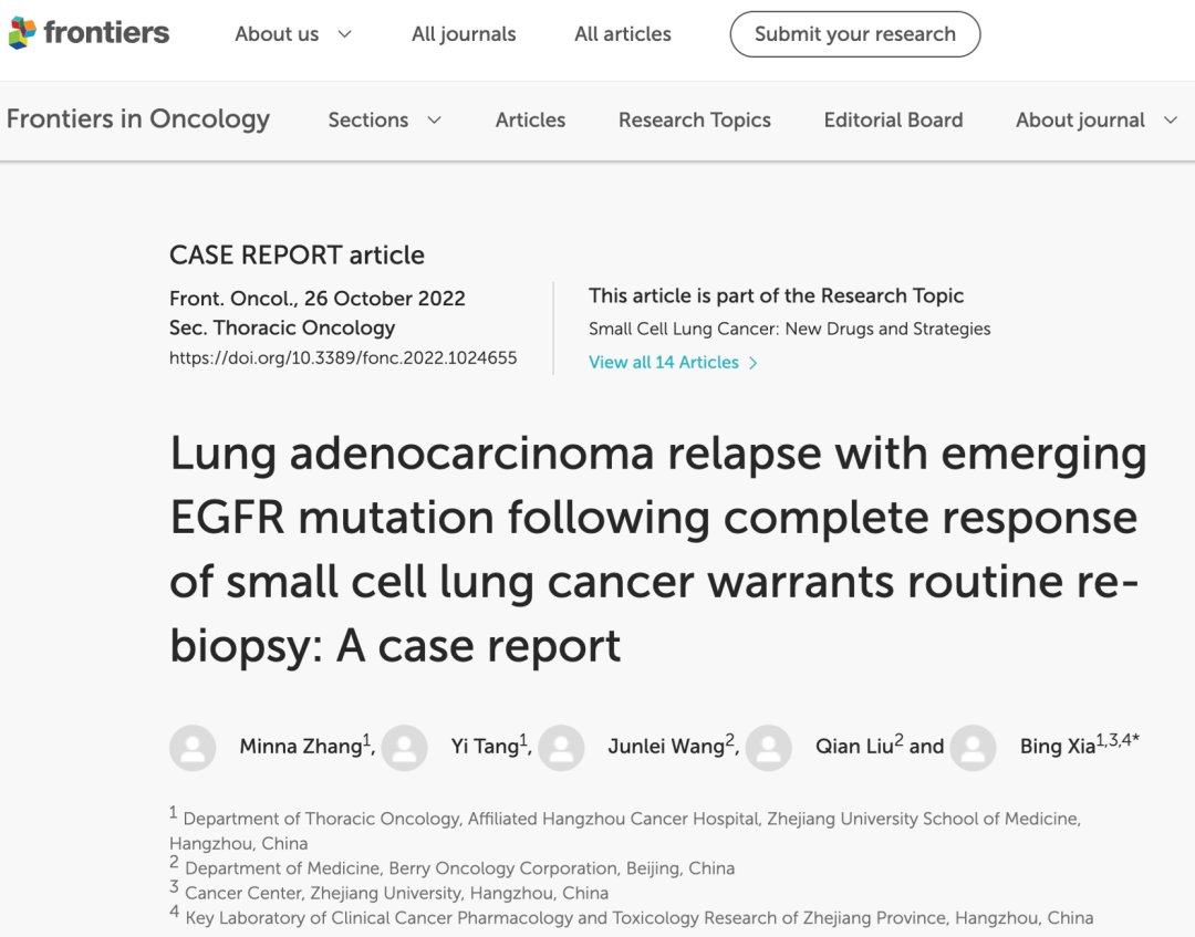 浙江大學(xué)附屬杭州腫瘤醫(yī)院夏冰院長團隊日前首次報道了一例SCLC初診患者,在后續(xù)兩次復(fù)發(fā)時病理檢測顯示為肺腺癌。通過啟明創(chuàng)投投資企業(yè)和瑞基因和全安?實體瘤全靶點基因檢測發(fā)現(xiàn),與SCLC病理樣本相比,該患者首次復(fù)發(fā)時出現(xiàn)EGFR第19外顯子缺失, 二次復(fù)發(fā)時出現(xiàn)EGFR T790M變異。該患者通過靶向治療獲得了較好的治療效果。該案例近期發(fā)表于國際期刊Frontiers in Oncology。