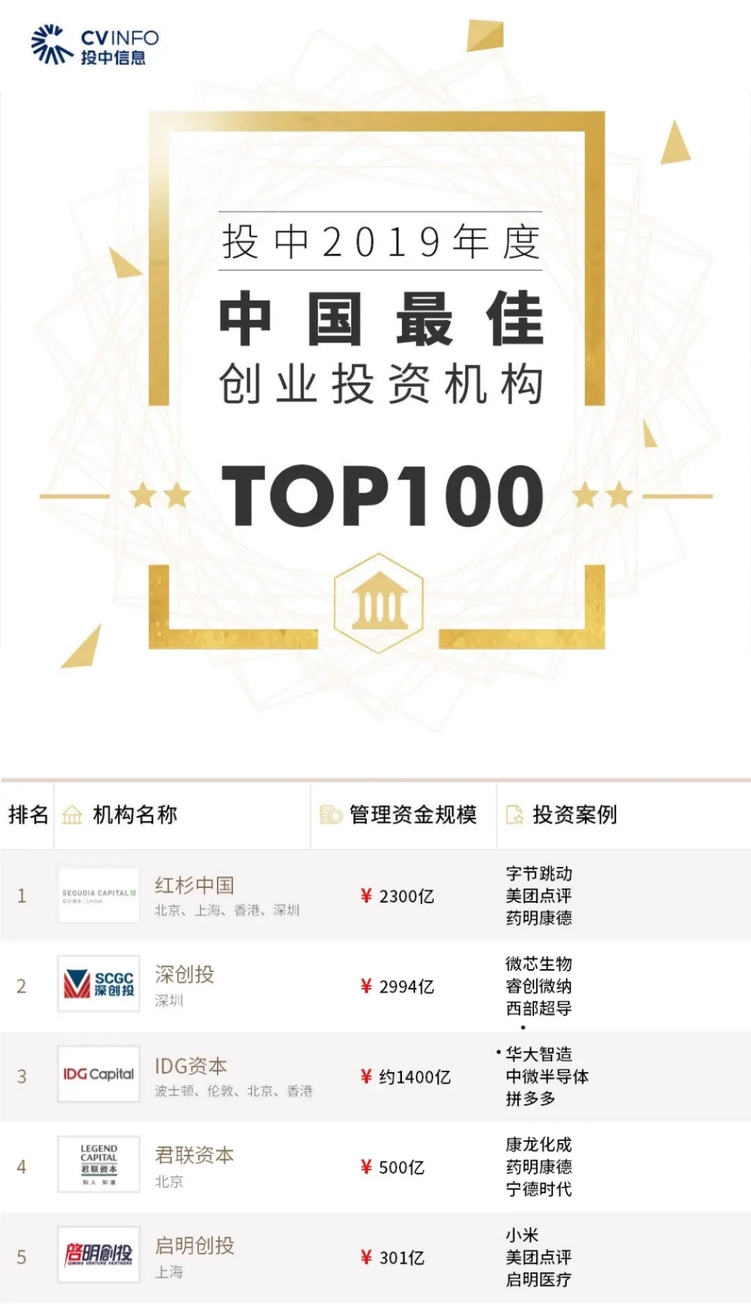 在2019年度中國最佳創(chuàng)業(yè)投資機構前100名中,啟明創(chuàng)投位列第五名。