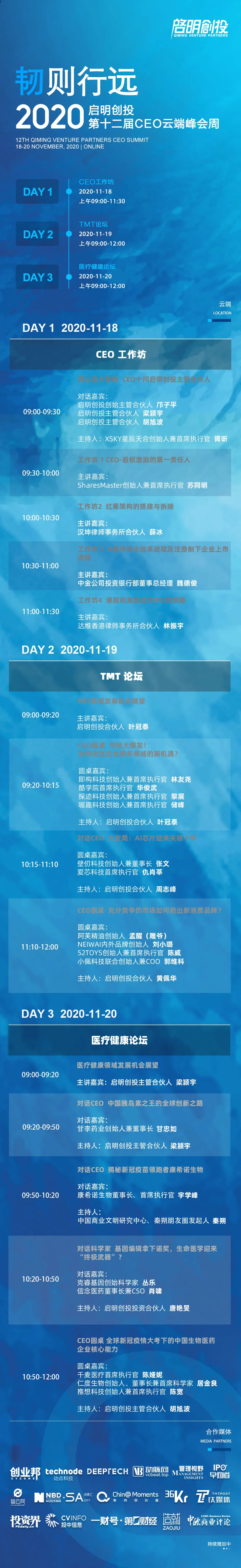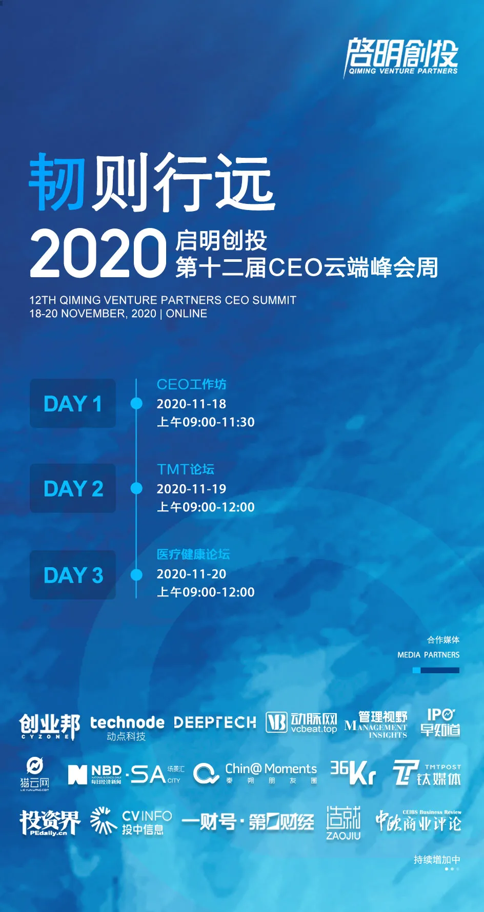 2020年11月18-20日,啟明創(chuàng)投歡迎您加入2020啟明創(chuàng)投第十二屆CEO云端峰會周,激蕩思想,共赴明日。