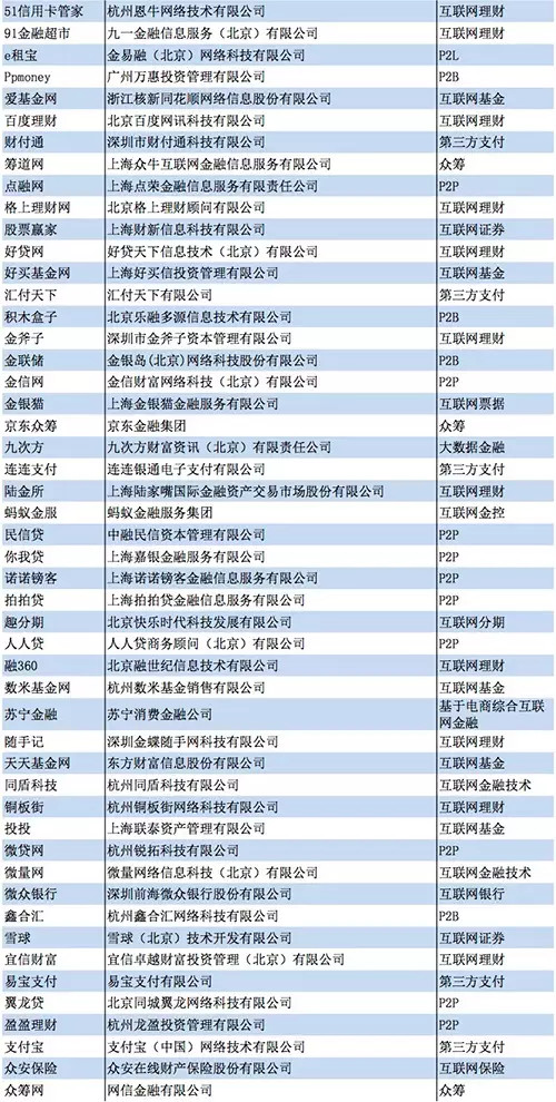 傳統(tǒng)金融領域的融合已經(jīng)跨越單純渠道合作階段,催生出各種各樣新的金融產品及業(yè)務形態(tài)。榜單中50家企業(yè)涉及中國互聯(lián)網(wǎng)銀行、互聯(lián)網(wǎng)保險、互聯(lián)網(wǎng)證券、互聯(lián)網(wǎng)理財、互聯(lián)網(wǎng)基金、互聯(lián)網(wǎng)分期、第三方支付、P2P、P2B、P2L、眾籌、大數(shù)據(jù)金融等16種互聯(lián)網(wǎng)金融企業(yè)。