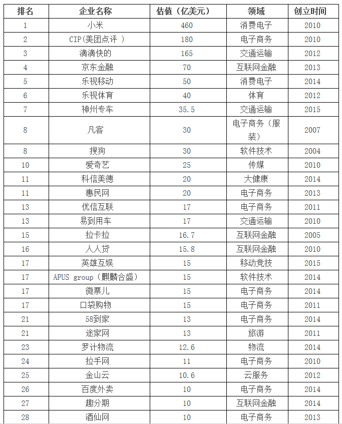 2015年中關村獨角獸企業(yè)榜單