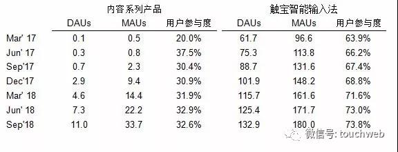 2018年9月,觸寶內(nèi)容系列產(chǎn)品的平均DAU為1,100萬,而2017年9月為70萬,相當(dāng)于同比增長14.7倍。