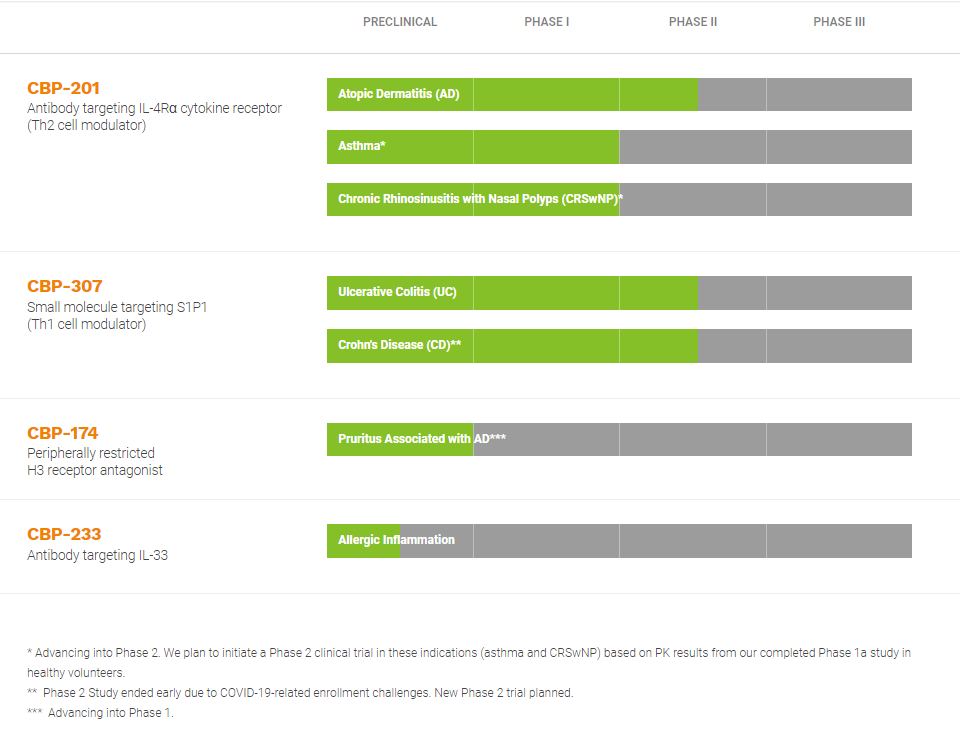 除具有Best-in-Class潛力的兩款創(chuàng)新藥——治療中重度特應(yīng)性皮炎的CBP-201和治療潰瘍性結(jié)腸炎的CBP-307之外,康乃德也在同步推進(jìn)三個(gè)用于治療多種嚴(yán)重的炎癥性疾病的創(chuàng)新藥的臨床前項(xiàng)目,其中包括兩個(gè)小分子候選藥物(CBP-174和CBP-312)和一種靶向IL-33的抗體(CBP-233)。康乃德?lián)碛衅湫滤幑芫€中所有產(chǎn)品的全球權(quán)利。