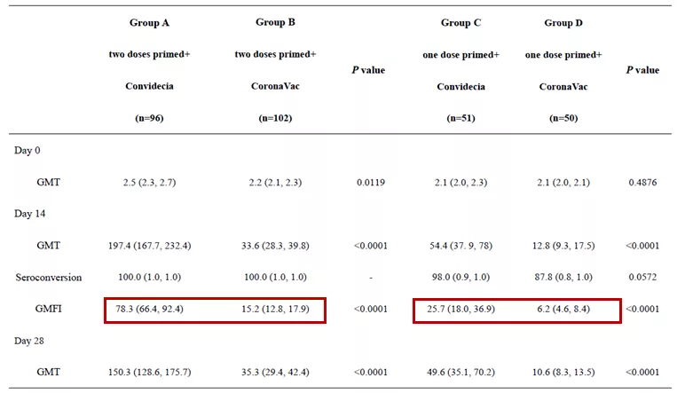 研究人員給志愿者接種兩針滅活疫苗后,再接種一針腺病毒載體新冠疫苗作為加強(qiáng),14天后中和抗體GMTs為197.4 (167.7, 232.4),抗體水平升高約78倍;若第三針用滅活疫苗進(jìn)行加強(qiáng),抗體水平為33.6 (28.3, 39.8),升高約15.2倍。該數(shù)據(jù)表明,序貫加強(qiáng)后產(chǎn)生的中和抗體增長水平顯著優(yōu)于同源加強(qiáng)的效果。