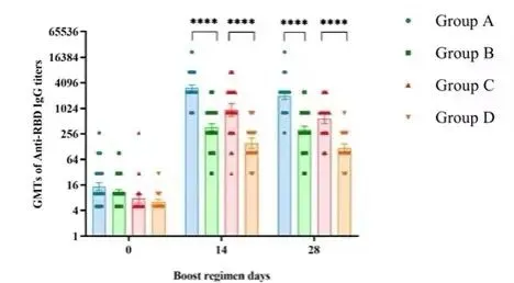 不同接種程序下RBD-特異性ELISA抗體反應(yīng)對比