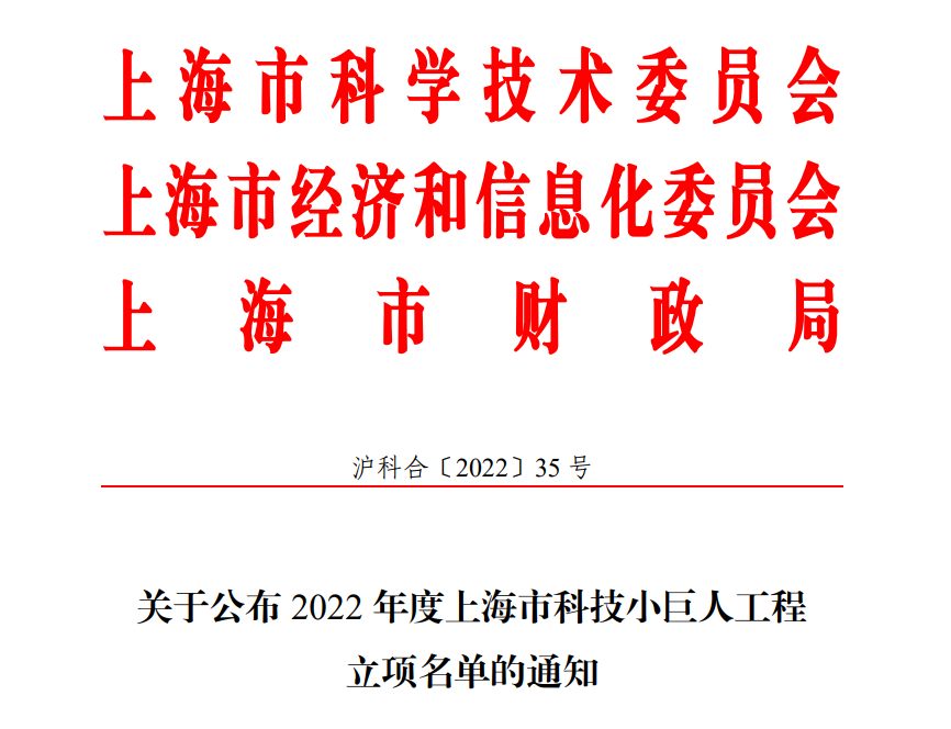 根據(jù)《關(guān)于發(fā)布上海市2022年度“科技創(chuàng)新行動計劃”科技小巨人項目申報指南的通知》(滬科合〔2022〕14號)要求,經(jīng)公開自主申報、各區(qū)審核推薦、專家評審和公示,上海市科學(xué)技術(shù)委員會、市經(jīng)濟和信息化委員會、市財政局審定了此次立項企業(yè)名單。