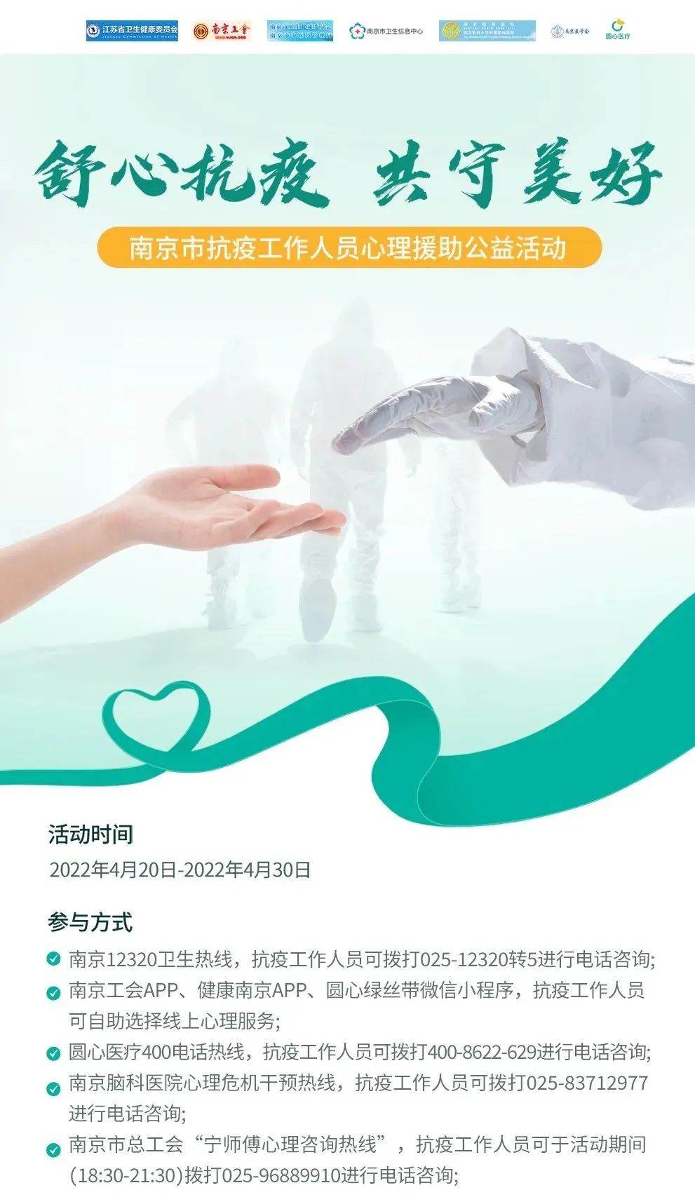 為緩解疫情給抗疫工作人員帶來的心理影響,堅定人們戰(zhàn)勝疫情的信念和疫情后重建的信心,在江蘇省衛(wèi)健委、南京市總工會、南京市衛(wèi)健委指導下,啟明創(chuàng)投投資企業(yè)圓心科技旗下品牌圓心醫(yī)療與南京市科教衛(wèi)體工會聯(lián)合會等共同啟動以“舒心抗疫,共守美好”為主題的心理援助公益活動,為南京市全市參與抗疫工作人員提供心理援助服務(wù)。