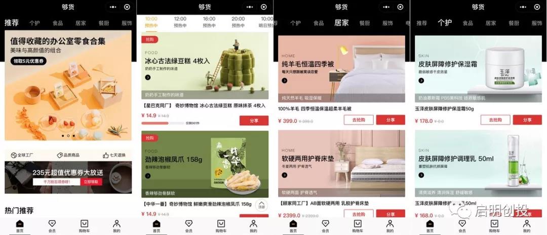 夠貨團隊關于市場機會的觀點是,更具消費力的女性及三四五線群體的生活消費需求其實并沒有被這種模式覆蓋到,因此夠貨想從定位上做差異化,目前的品類也主打美妝、家居、食品等。