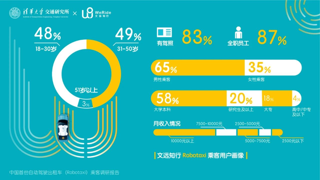 中青年群體是文遠(yuǎn)知行Robotaxi的主要乘客,近九成是全職員工,近80%擁有本科以上學(xué)歷,大部分擁有駕照。這些乘客中,有大部分來自傳統(tǒng)出租車/網(wǎng)約車市場。近六成乘客使用文遠(yuǎn)知行Robotaxi進(jìn)行日常通勤。