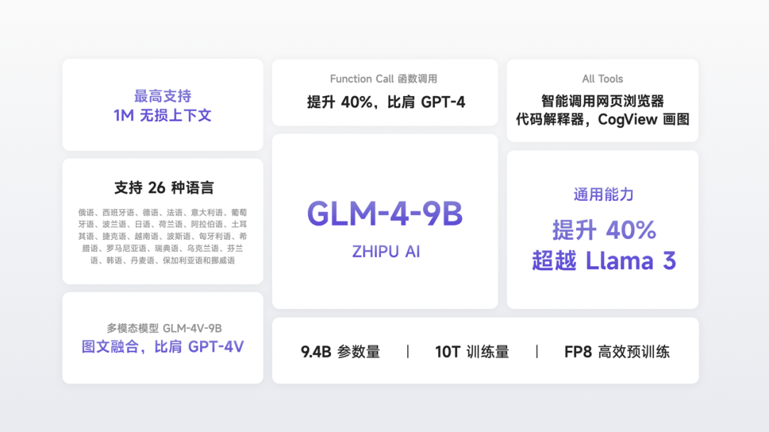 在預(yù)訓(xùn)練方面,GLM-4-9B使用了超過10T高質(zhì)量多語言數(shù)據(jù),通用能力相比上一代模型提升40%,甚至超過了Llama-3-8B。模型一共支持26種語言,并且最高支持1M(兩百萬字)的長文本。GLM-4-9B的函數(shù)調(diào)用能力提升了40%,性能比肩GPT-4,并且全面支持All Tools調(diào)用能力。基于文本基座,智譜AI還擴展了多模態(tài)模型GLM-4V-9B,能夠很好地融合文本和視覺模態(tài),其性能比肩GPT-4V。