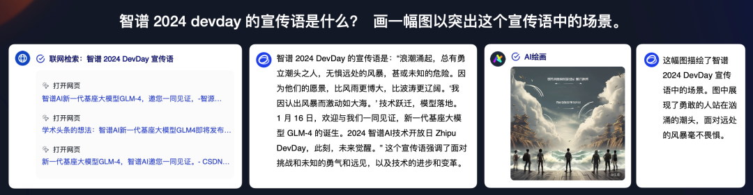 GLM-4實現(xiàn)自主根據(jù)用戶意圖,自動理解、規(guī)劃復雜指令,自由調(diào)用網(wǎng)頁瀏覽器、Code Interpreter代碼解釋器和多模態(tài)文生圖大模型,以完成復雜任務。