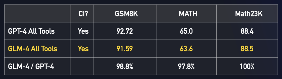 All Tools-代碼解釋器:GLM-4能夠通過自動調(diào)用python解釋器,進行復雜計算(例如復雜方程、微積分等),在GSM8K、MATH、Math23K等多個評測集上都取得了接近或同等GPT-4 All Tools的水平。
