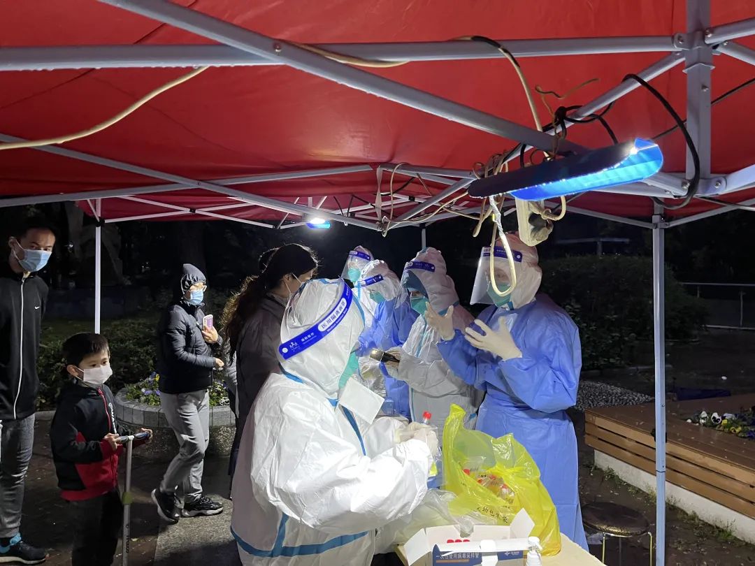 大家與當(dāng)?shù)厣鐓^(qū)醫(yī)院的醫(yī)生護(hù)士們一起,為8萬多居民的核酸樣本采集而奔波。上午9時(shí)集結(jié)完畢后,她們一直工作到深夜12時(shí)30分;在原定結(jié)束時(shí)間晚上11時(shí)以后,又緊急前往其他社區(qū)支援。