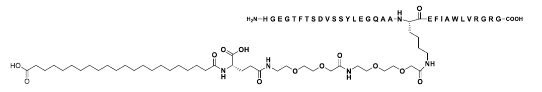 GZR18注射液是一種基于脂肪酸?;O(shè)計(jì)的GLP-1RA,具有每周或每?jī)芍芙o藥一次的潛力,其與人源GLP-1分子的同源性高達(dá)94%。GZR18注射液在人源GLP-1肽鏈基礎(chǔ)上進(jìn)行了3處氨基酸位點(diǎn)修飾,從而將脂肪酸?;x擇性限制到第26位賴(lài)氨酸上。GZR18注射液選用22碳脂肪二酸側(cè)鏈,與白蛋白強(qiáng)力且可逆結(jié)合,從而延長(zhǎng)作用時(shí)間。多肽主鏈和脂肪酸側(cè)鏈由2個(gè)OEG(3,8-二氧代氨基辛酸)間隔子和1個(gè)L-γ谷氨酸連接子連接,使GZR18注射液的肽鏈在體內(nèi)與白蛋白的物理距離更近,利于空間折疊,降低藥物降解,延長(zhǎng)半衰期。GZR18注射液獨(dú)特的分子設(shè)計(jì)優(yōu)化其與GLP-1受體的親和力,減少GLP-1受體介導(dǎo)的胃腸道反應(yīng),提高藥物耐受性。給予適當(dāng)?shù)牡味ńo藥方案,GZR18注射液有望實(shí)現(xiàn)更高的治療劑量,以期實(shí)現(xiàn)更好的治療效果。