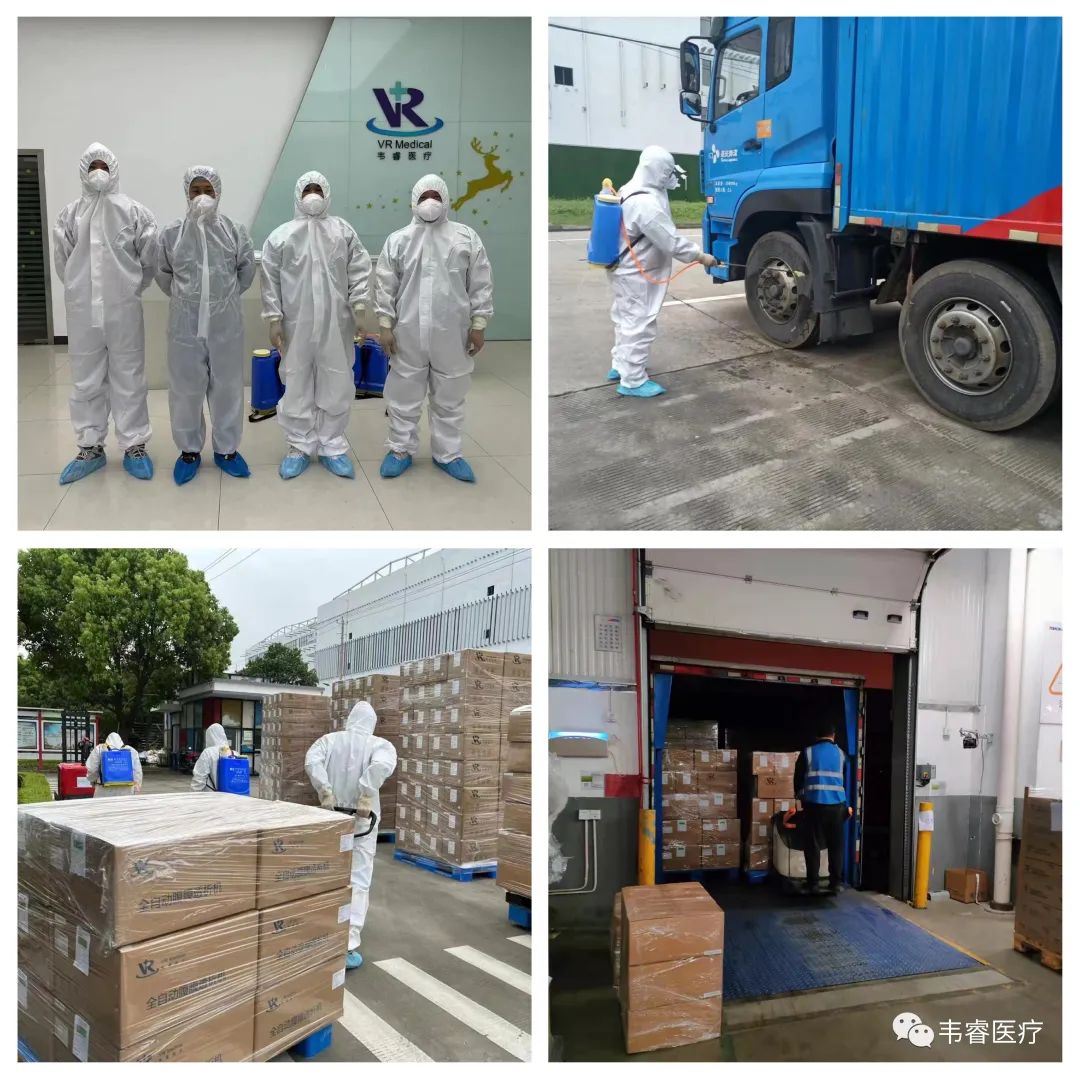 為了實(shí)現(xiàn)防疫要求,韋睿醫(yī)療決定在一個(gè)小時(shí)內(nèi)完成轉(zhuǎn)倉、消殺和裝載等全部工作。為確保整個(gè)運(yùn)輸過程在安全、有序、高效中進(jìn)行,韋睿醫(yī)療各部門爭分奪秒,連夜制定“車輛入周裝貨的閉環(huán)管理方案”,既有條不紊地做好產(chǎn)品質(zhì)控和出貨安排,又嚴(yán)格做好個(gè)人防護(hù)和環(huán)境消殺等防疫準(zhǔn)備。