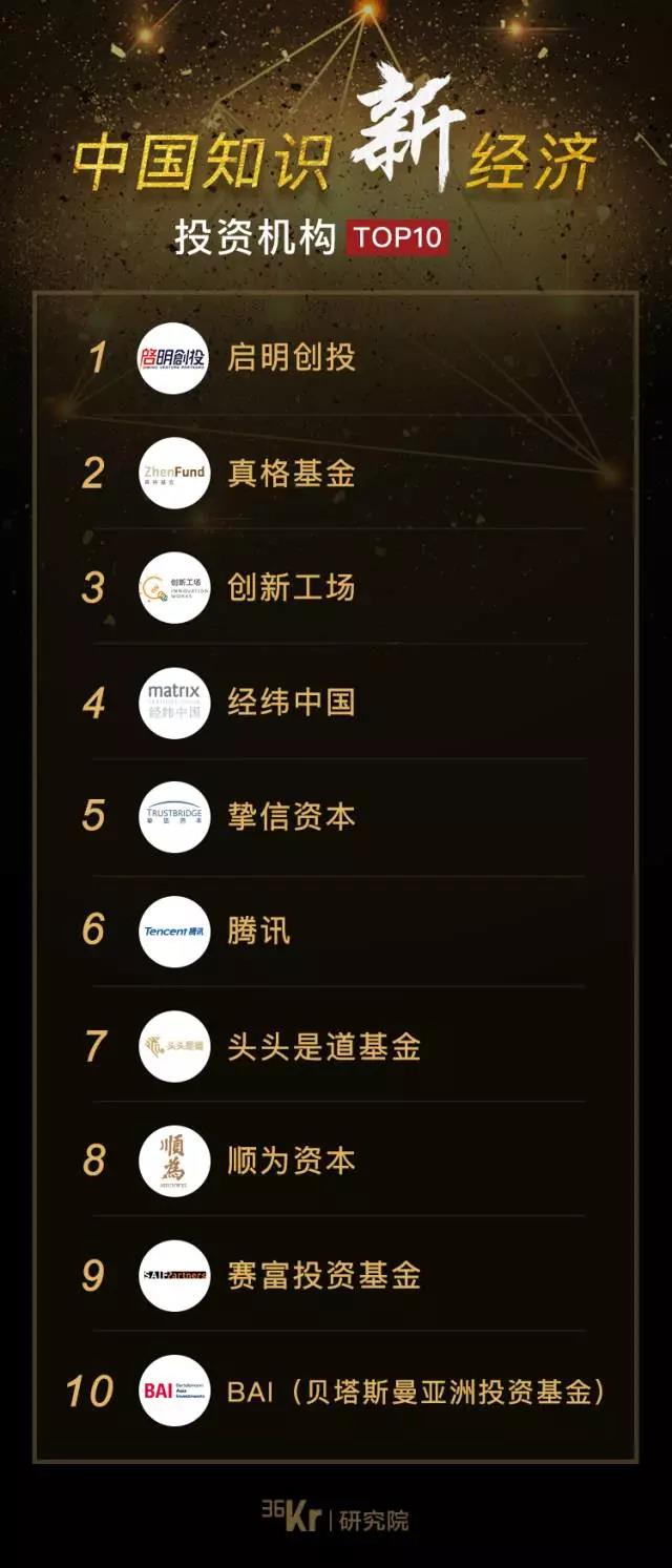 5月6日,36氪在“知識的煉金時代——WISEx知識新經(jīng)濟(jì)峰會”上發(fā)布了中國知識新經(jīng)濟(jì)投資機(jī)構(gòu)top10榜單。