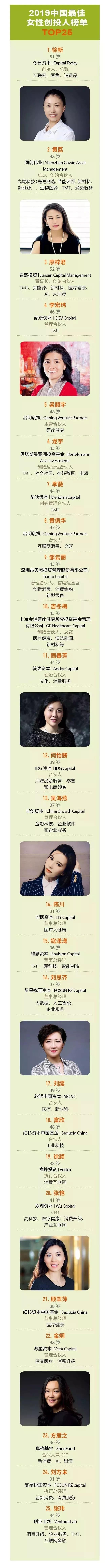 在此次評選中,啟明創(chuàng)投有兩位女性創(chuàng)投人光榮上榜,主管合伙人梁穎宇女士位列第5位;合伙人黃佩華女士位列第8位!