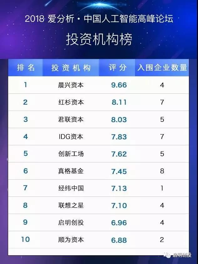 啟明創(chuàng)投依靠敏銳的商業(yè)嗅覺和前瞻性的市場預(yù)判能力,投出多家人工智能領(lǐng)域的優(yōu)秀企業(yè)和數(shù)家AI獨(dú)角獸,榮登本次“2018愛分析·中國人工智能投資機(jī)構(gòu)”榜單第9位。 啟明創(chuàng)投投資的4家AI獨(dú)角獸和準(zhǔn)獨(dú)角獸企業(yè)——曠視科技、云知聲、優(yōu)必選和同盾科技位列“2018愛分析·中國人工智能創(chuàng)新企業(yè)榜”前20強(qiáng)。