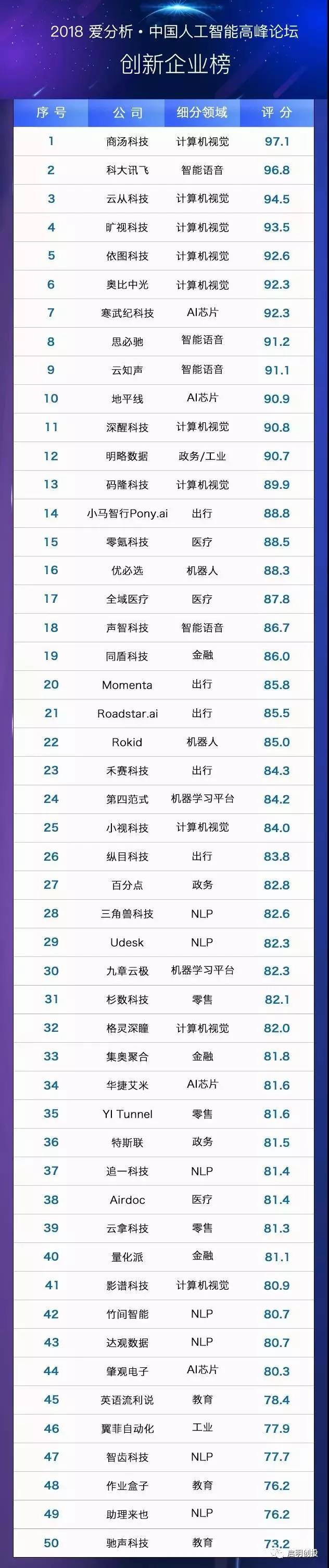 以下是“2018愛分析·中國人工智能創(chuàng)新企業(yè)榜”和“2018愛分析·中國人工智能投資機(jī)構(gòu)”完整榜單: