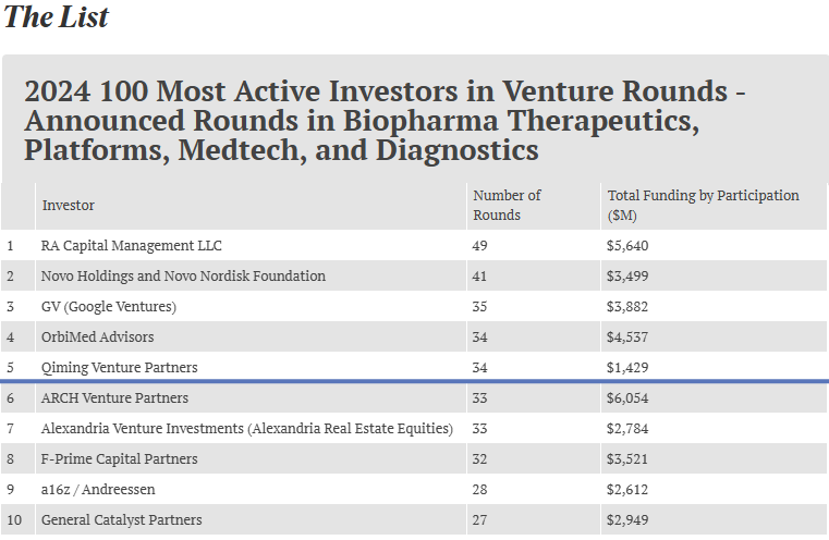 啟明創(chuàng)投榮獲2024年全球醫(yī)藥創(chuàng)業(yè)投資機(jī)構(gòu)TOP5,且是前五名中唯一一家中國創(chuàng)業(yè)投資機(jī)構(gòu)。