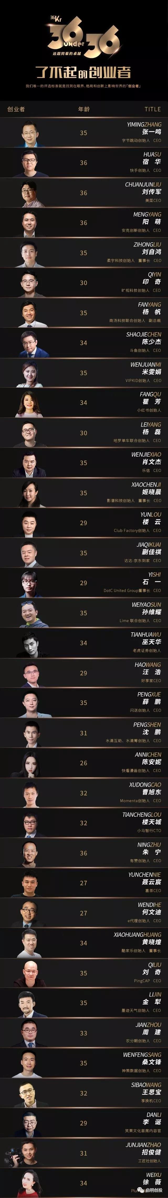 同時,今日頭條創(chuàng)始人兼CEO張一鳴、曠視科技創(chuàng)始人兼CEO印奇和Plum創(chuàng)始人兼CEO徐薇獲評“36位36歲以下了不起的創(chuàng)業(yè)者”。