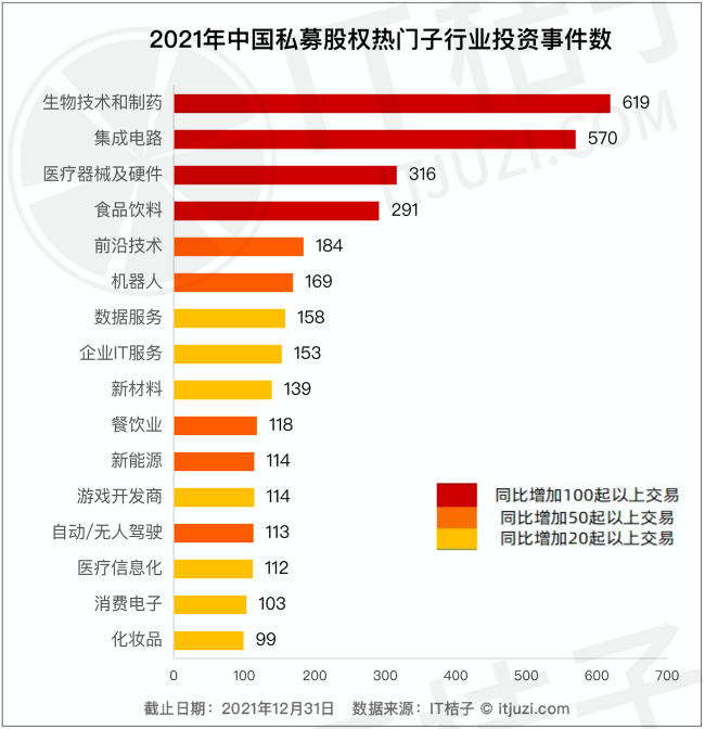 從投資角度觀察,2021年中國新經(jīng)濟投資熱門領(lǐng)域主要涉及醫(yī)療、先進制造、消費、企業(yè)服務(wù)等幾個大行業(yè),細分子行業(yè)包括生物技術(shù)和制藥、集成電路、醫(yī)療器械及硬件、食品飲料、前沿技術(shù)、機器人、數(shù)據(jù)服務(wù)、企業(yè)IT服務(wù)等。