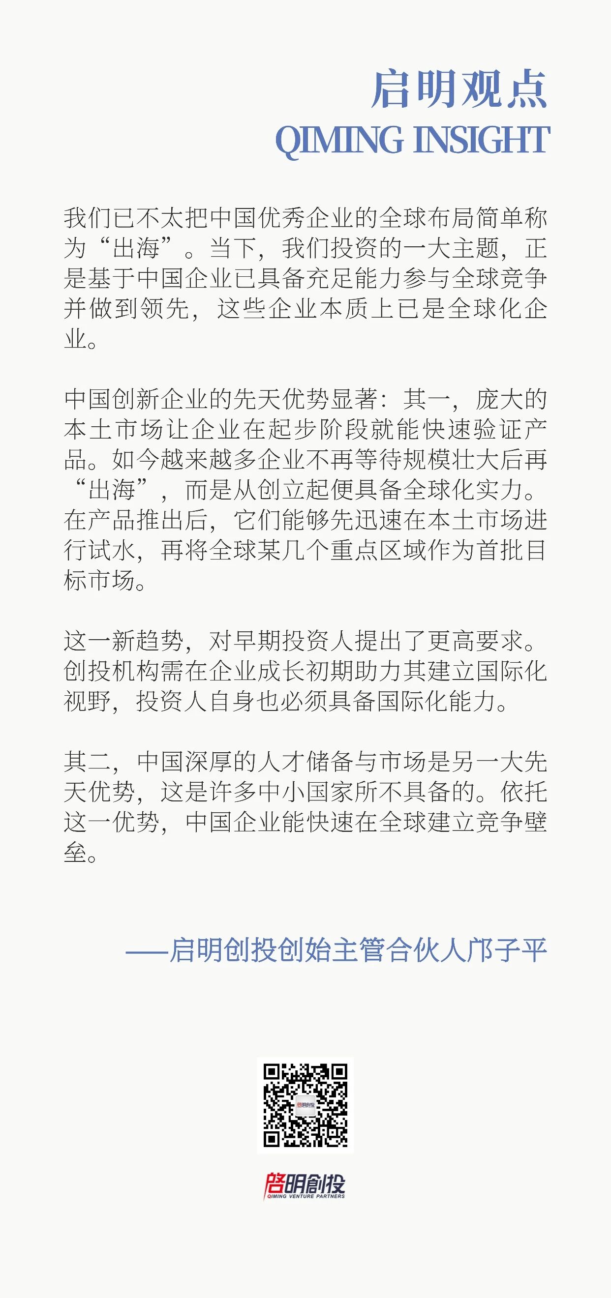 談及企業(yè)出海,鄺子平表示,“當(dāng)下,我們投資的一大主題,正是基于中國企業(yè)已具備充足能力參與全球競爭并做到領(lǐng)先?!彼赋?,如今企業(yè)“生而全球化”,投資機(jī)構(gòu)也需同步升級為“生而全球化”的機(jī)構(gòu)。