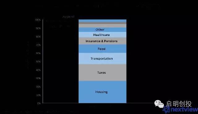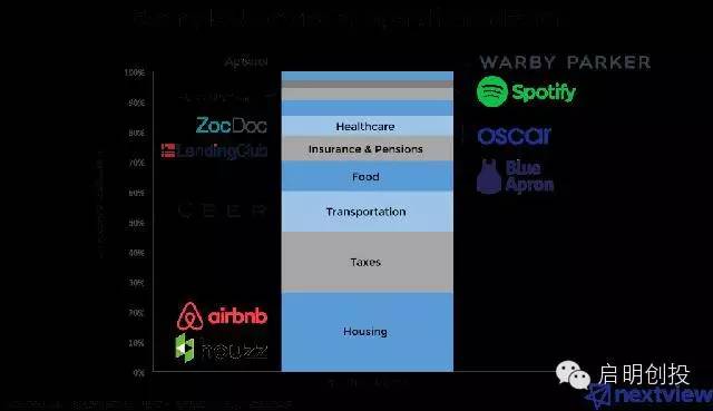 遵循這個邏輯我們就不難發(fā)現(xiàn),Uber、Airbnb這兩個全球最具價值的創(chuàng)企都屬于消費大類:行和住。當然,它們只是眾多公司的兩個代表而已。 下圖是消費者支出最多的幾大類: