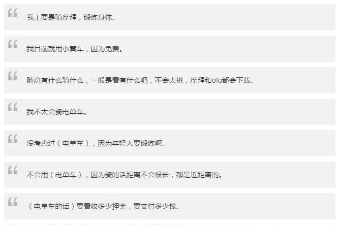 選擇哪種出行方式體驗(yàn)最深的既不是創(chuàng)始人也不是投資人,而是用戶老大。于是我們?cè)谙掳喔叻迤趤?lái)到了10號(hào)線新天地地鐵口隨機(jī)采訪了10位共享單車用戶,一起聽聽他們?cè)趺凑f(shuō)。