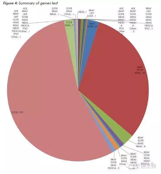 多重基因檢測逐漸成為趨勢 從此次EMQN機(jī)構(gòu)提供的數(shù)據(jù)來看,多重基因的檢測比例逐步上升:近一半實驗室(141家,45.3%)不只檢測EGFR單基因突變,其中97家同時檢測BRAF、EGFR、KRAS基因,其余44家實驗室同時還檢測了更多基因,如ALK、Ckit、HRAS、NRAS、PIK3CA、TP53及其它基因。