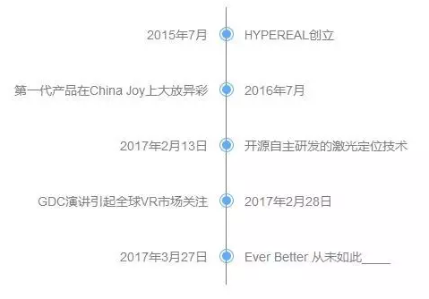HYPEREAL的第一代產(chǎn)品在2016年7月的China Joy上大放異彩,被媒體稱為VR界的黑馬。2017年2月13日HYPEREAL又慷慨開源了自主研發(fā)的激光定位技術(shù),是世界上唯一一家100%開源定位系統(tǒng)的公司。2017年2月28日HYPEREAL在美國舊金山舉行的VRDC@GDC上做了題為“VR in China”的演講并同臺(tái)演示Oculus Rift和自家產(chǎn)品玩同一款游戲,引起了美國媒體和全球VR市場(chǎng)的關(guān)注。