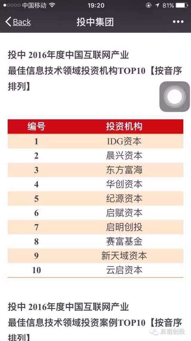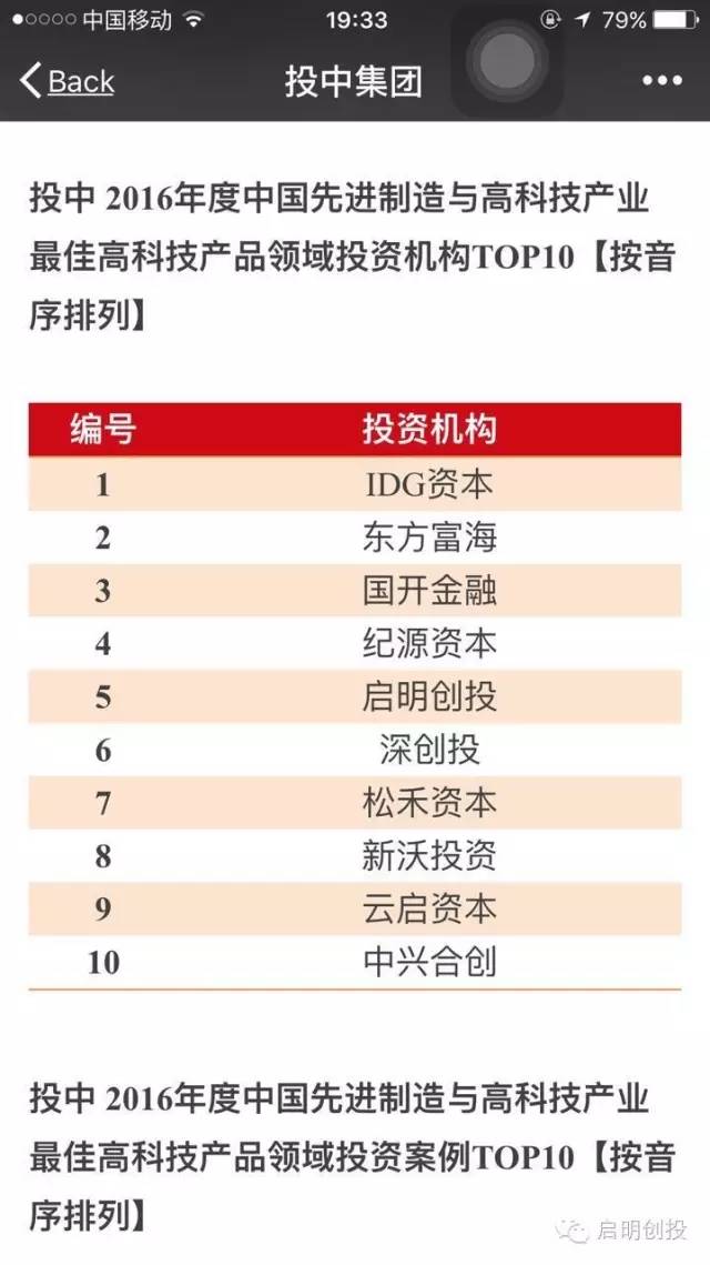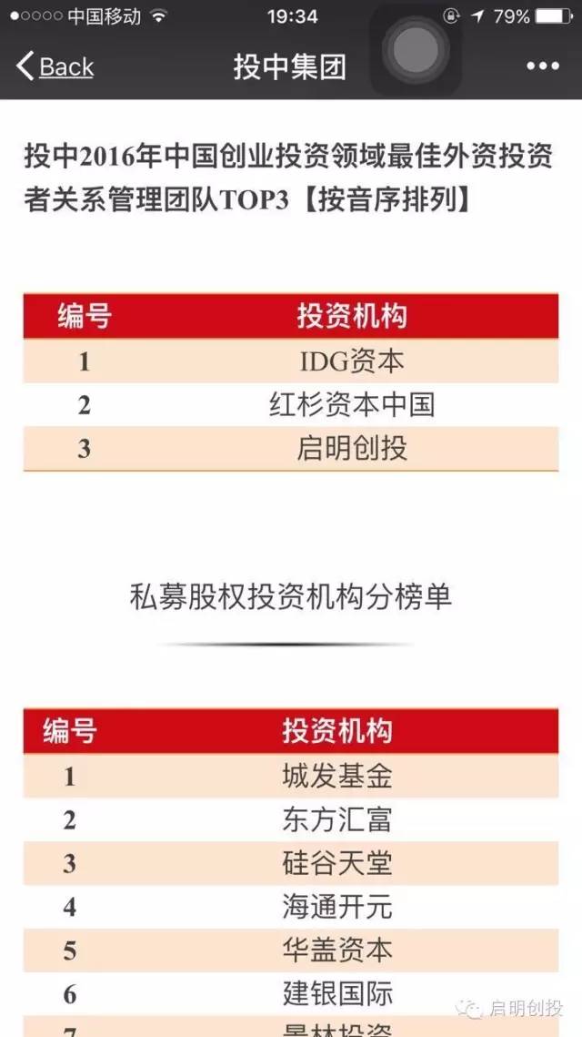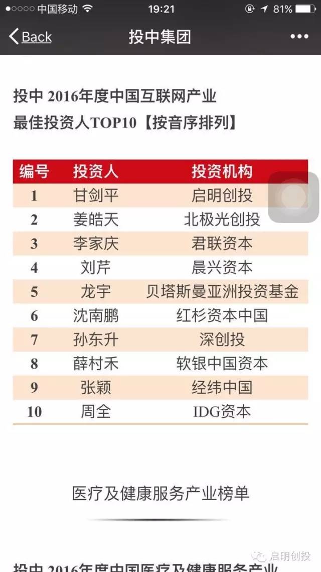 昨晚,在投中2016中國投資(深圳)年會上,“投中2016年度中國VC/PE產(chǎn)業(yè)榜”隆重發(fā)布。啟明創(chuàng)投分別斬獲“互聯(lián)網(wǎng)產(chǎn)業(yè)”、“醫(yī)療及健康服務(wù)產(chǎn)業(yè)”、“文化及娛樂傳媒產(chǎn)業(yè)”、“先進制造與高科技產(chǎn)業(yè)”、“新能源與清潔技術(shù)產(chǎn)業(yè)”幾乎涵蓋所有行業(yè)領(lǐng)域 “投資機構(gòu)TOP10”的稱號。同時還獲評“投中2016年中國最活躍外資創(chuàng)業(yè)投資機構(gòu)TOP10”、“投中2016年中國最佳回報外資創(chuàng)業(yè)投資機構(gòu)TOP10”、“投中2016年中國創(chuàng)業(yè)投資領(lǐng)域最佳外資投資者關(guān)系管理團隊TOP3”。而且在各產(chǎn)業(yè)領(lǐng)域最佳投資案例TOP10中,啟明投資的多家優(yōu)秀企業(yè)都榜上有名。